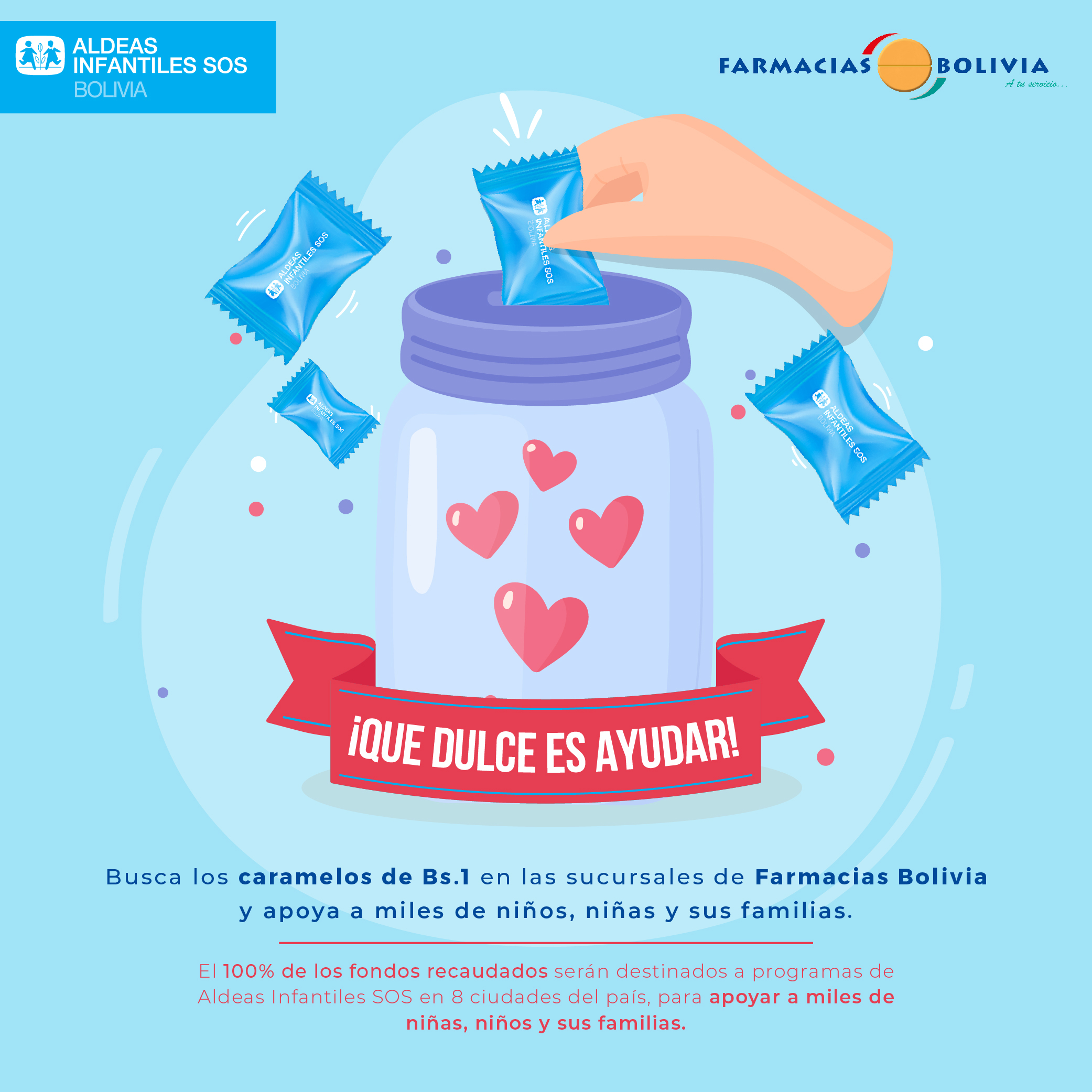 La campaña que DULCE ES AYUDAR, contribuirá a brindar herramientas tecnológicas para los niños y niñas en situación de vulnerabilidad. Gracias a la alianza con FARMACIAS BOLIVIA, a partir de ahora los clientes y población en general podrá adquirir unos deliciosos DULCES SOS y sumarse a esta gran causa.