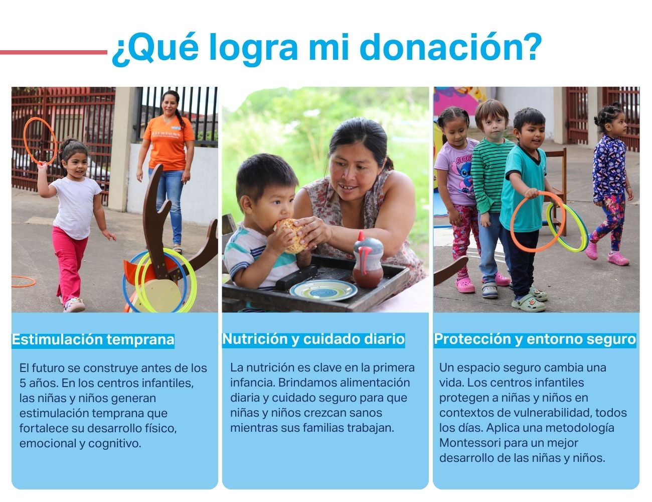 Lo hacemos con el Servicio de fortalecimiento familiar y otras acciones de apoyo, orientación y seguimiento.También brindamos cuidado alternativo a niñas y niños que ya perdieron el cuidado de sus familias, buscando siempre la mejor alternativa familiar posible.