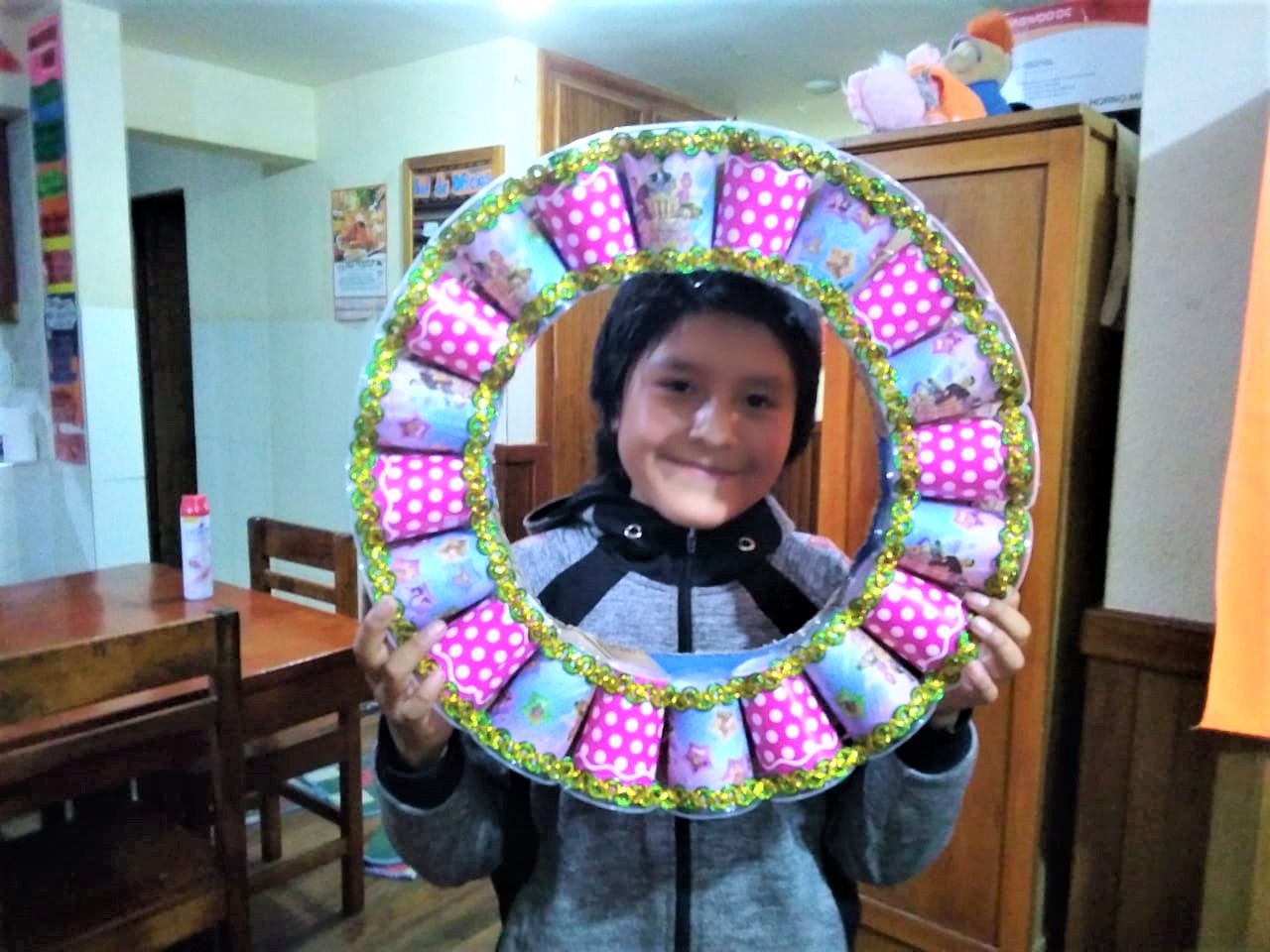 Roger y el resto de las niñas y niños demostraron su creatividad, convirtieron deshechos de cartón, periódicos pasados, CDs y botellas de plástico y vidrio en coloridos zapateros porta objetos, adornos navideños, posa vasos, entre otros productos que ahora son parte de la decoración de sus casas.