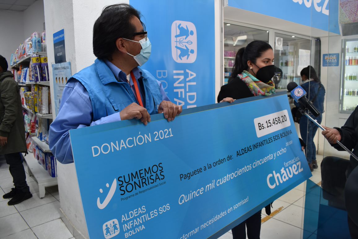 La Cadena de Farmacias Chávez, como parte de su programa de RSE “Sumemos Sonrisas”, firmó un convenio con Aldeas Infantiles SOS que beneficiará a más de 3000 niñas y niños de los departamentos de Cochabamba, Oruro y Tarija, habiendo recaudado, en esta primera etapa, 15.458,20 bolivianos.