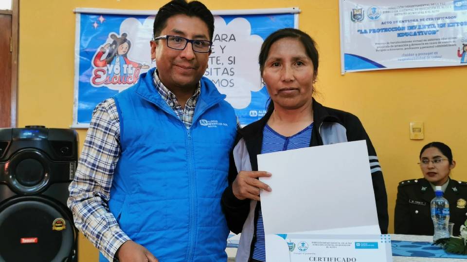 Lic. Raúl Pacosillo, Gerente Operativo de Aldeas Infantiles SOS en El Alto, durante la entrega de certificados.